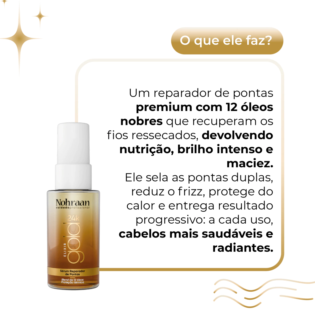 Finalize com o Elixir 24k e eleve seu tratamento com um toque de ouro: pontas reparadas, frizz controlado e muito mais luminosidade.