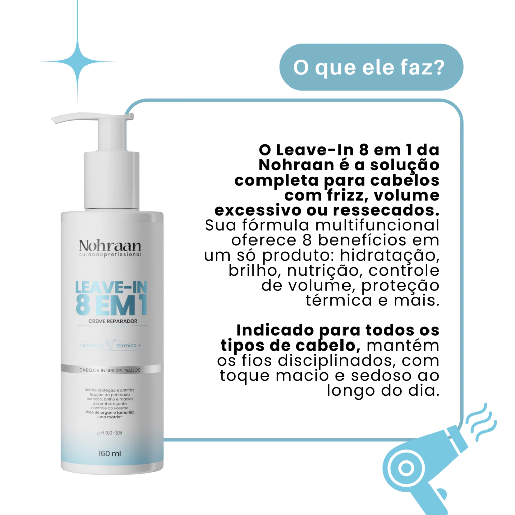 O Leave-in 8 em 1 oferece proteção térmica, controle de volume, hidratação profunda, brilho, nutrição e fixação de penteado – tudo em um só produto.